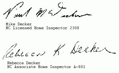 ![]() | On Guard Home InspectionsWebsite: http://www.onguardhomeinspections.comEmail: mike@onguardhomeinspections.com Phone: (919) 934-2983 ยท (919) 649-4153 FAX: (919) 585-4405 On Guard Home Inspections 216 Norwood Drive Clayton, NC 27527 Inspector: Mike Decker License: NC # 2308 Associate Inspector: Rebecca Decker License NC #A-801 |